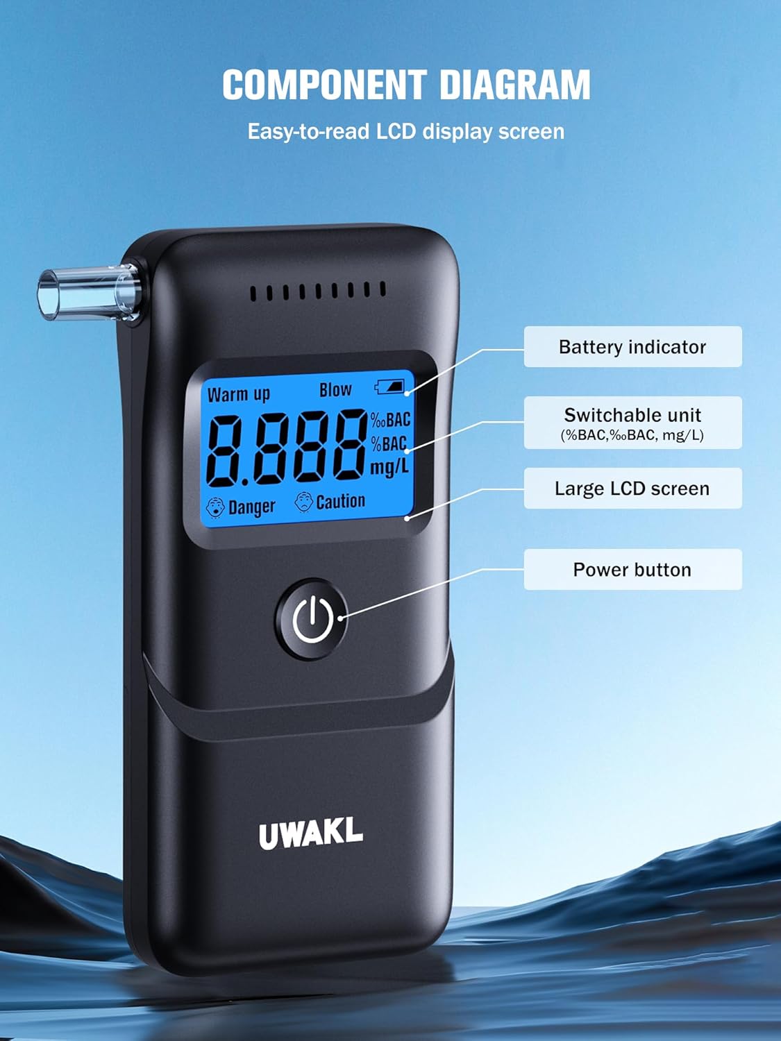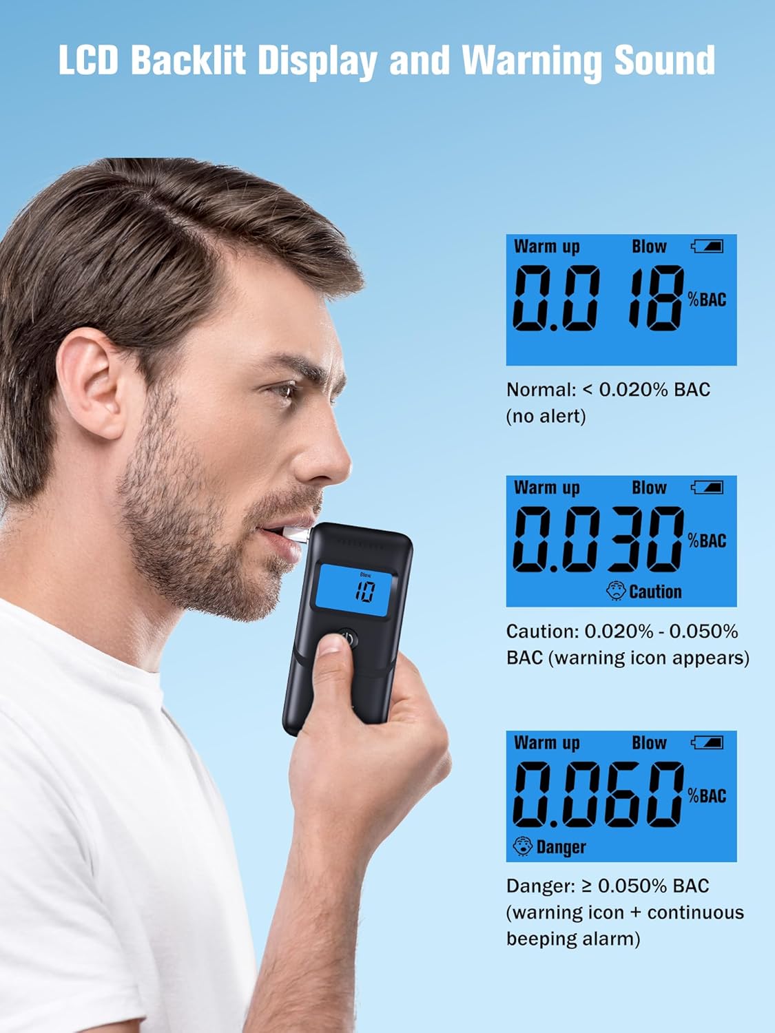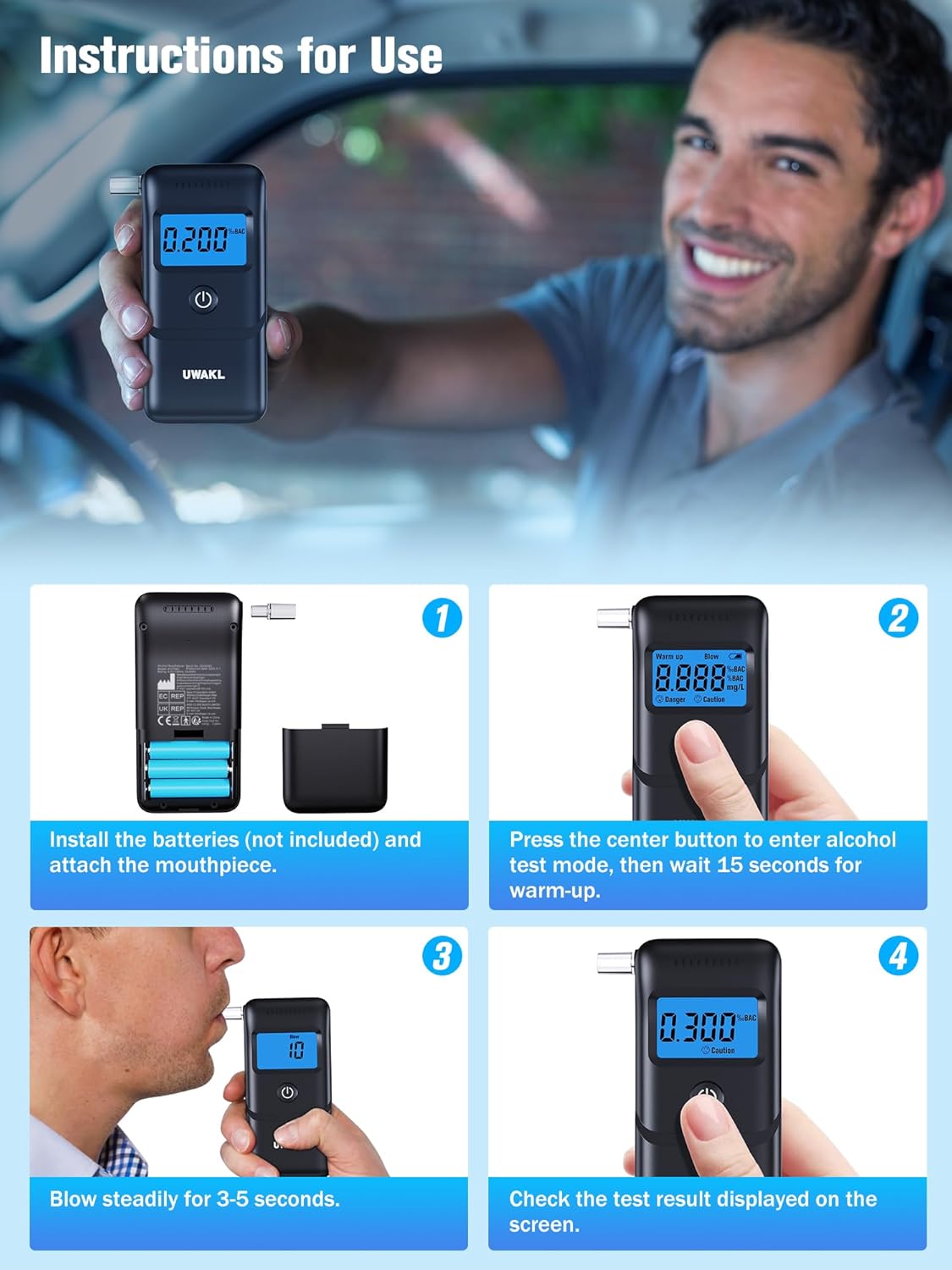 Easy to Use & Energy Efficient: Simply insert 3 AAA batteries (not included), press the button for a few seconds to power on, and wait 15 seconds to warm up. Blow evenly into the device for 3–5 seconds, and results will appear within seconds on the blue backlit LCD screen. The data is easy to read, and the device will automatically shut off approximately 20 seconds after displaying the test result if no further operation is performed, effectively conserving energy