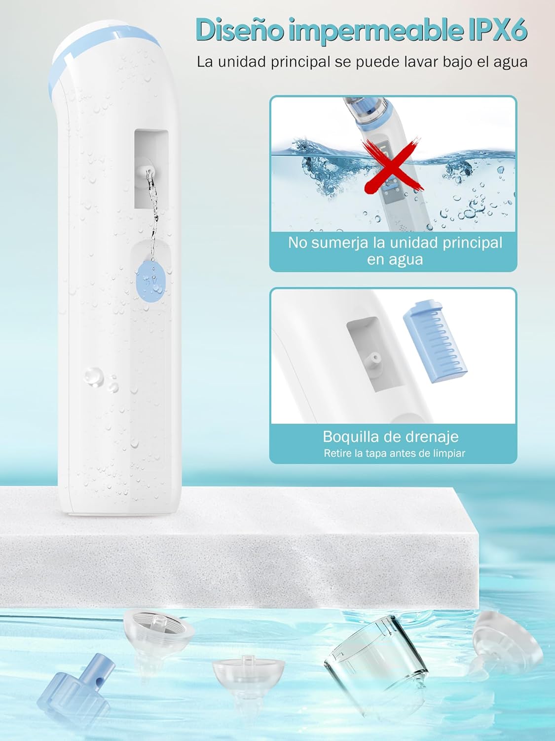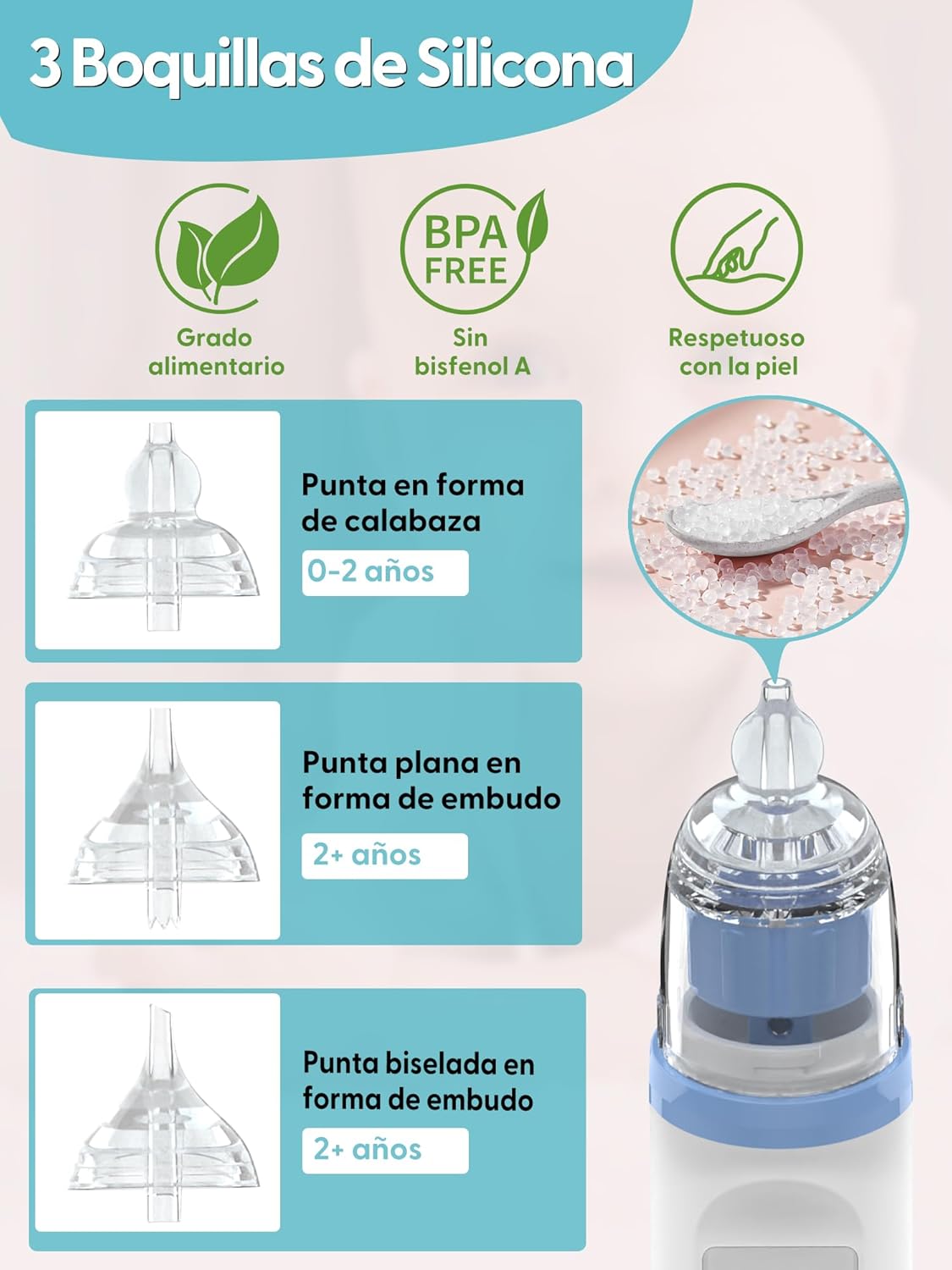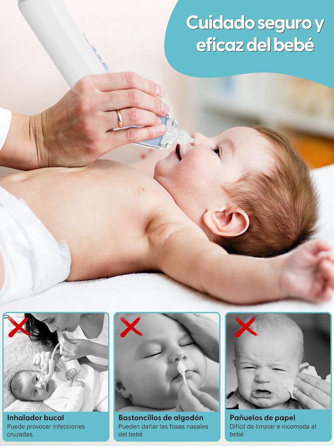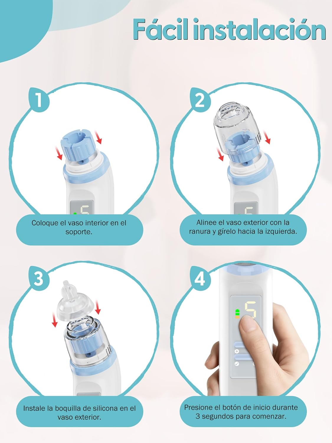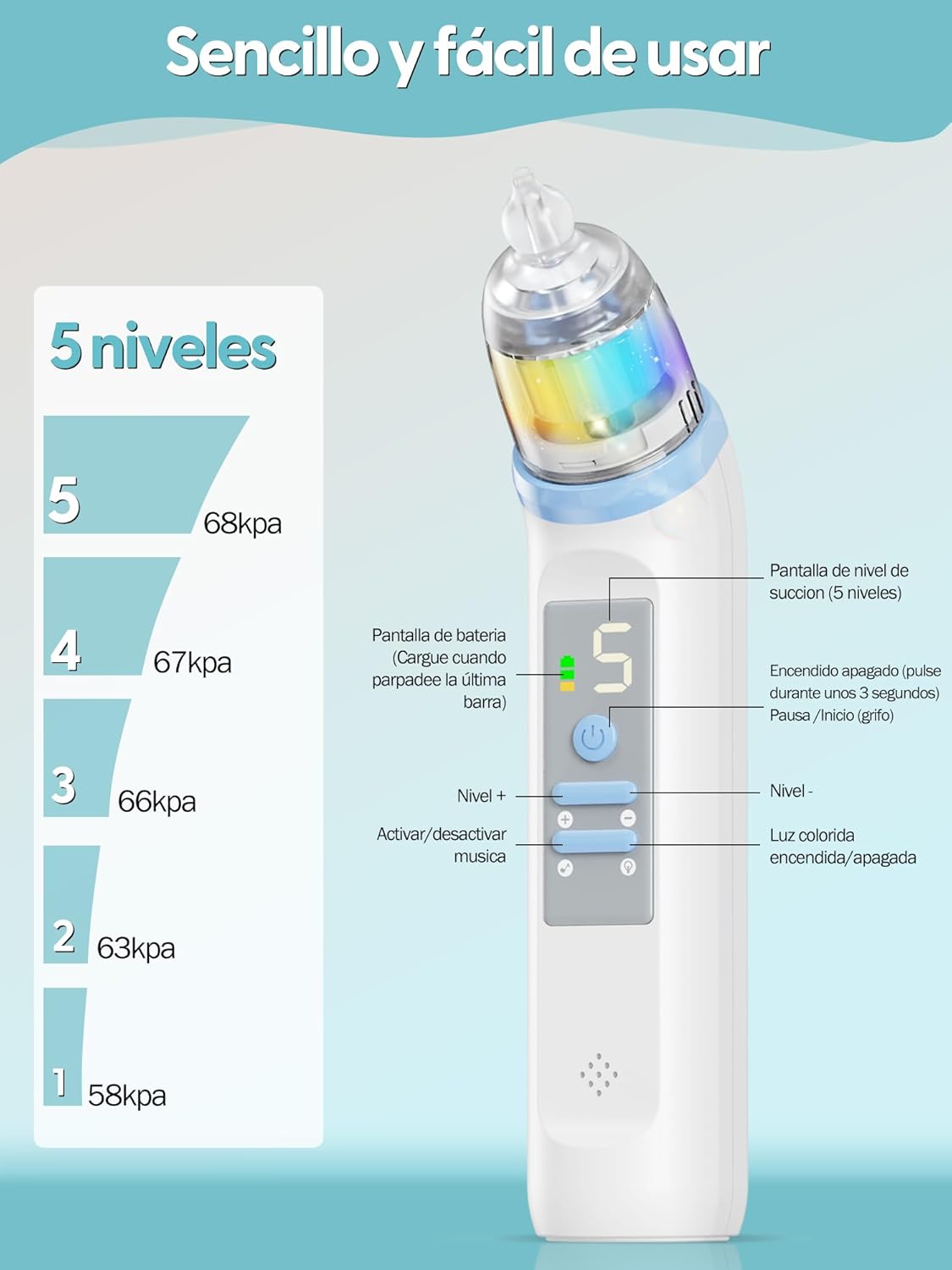 Fácil de usar: El limpiador nasal bebe está diseñado para eliminar la mucosidad de manera segura, eficiente y cómoda. La pantalla LED muestra claramente el nivel de succión y la batería restante. Es muy fácil de usar: solo presiona el botón de encendido, inserta el dispositivo en la narina de tu bebé y espera a que la mucosidad sea aspirada. (Nota: el saca mocos no funciona mientras se está cargando.)